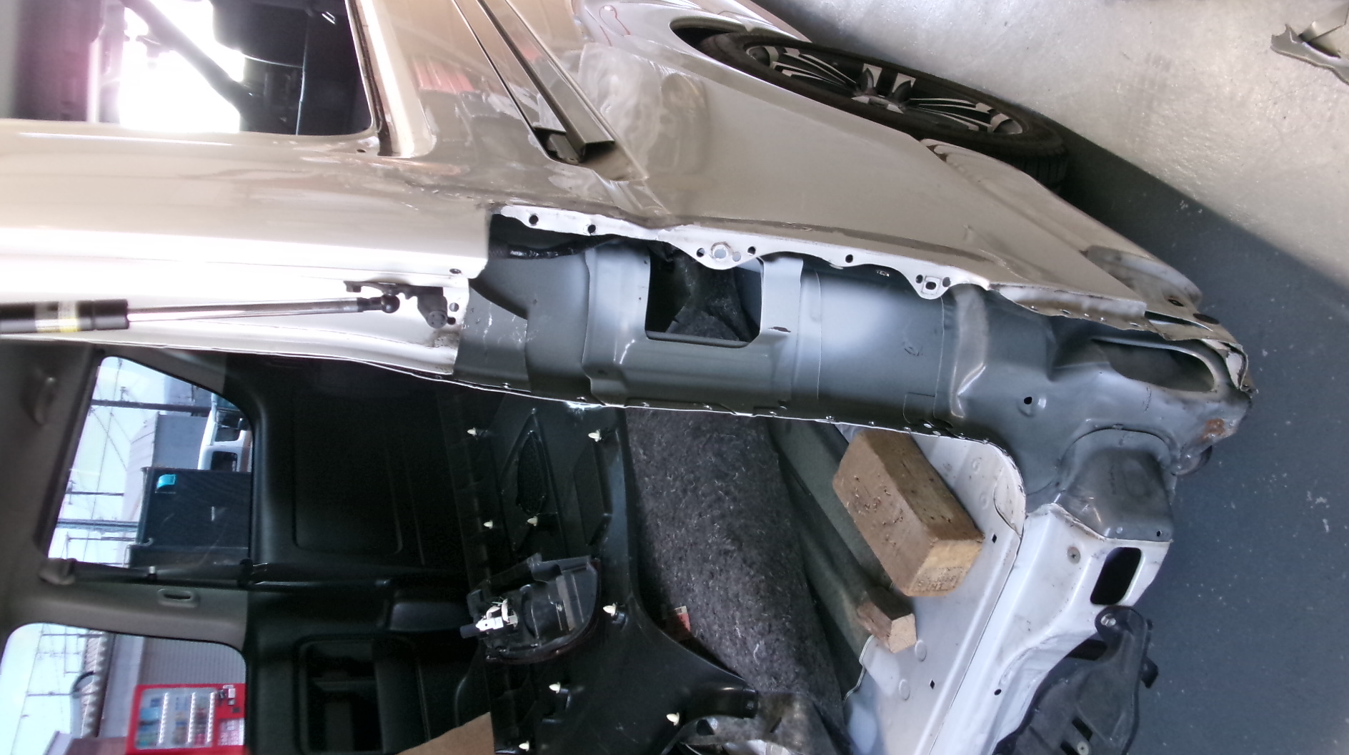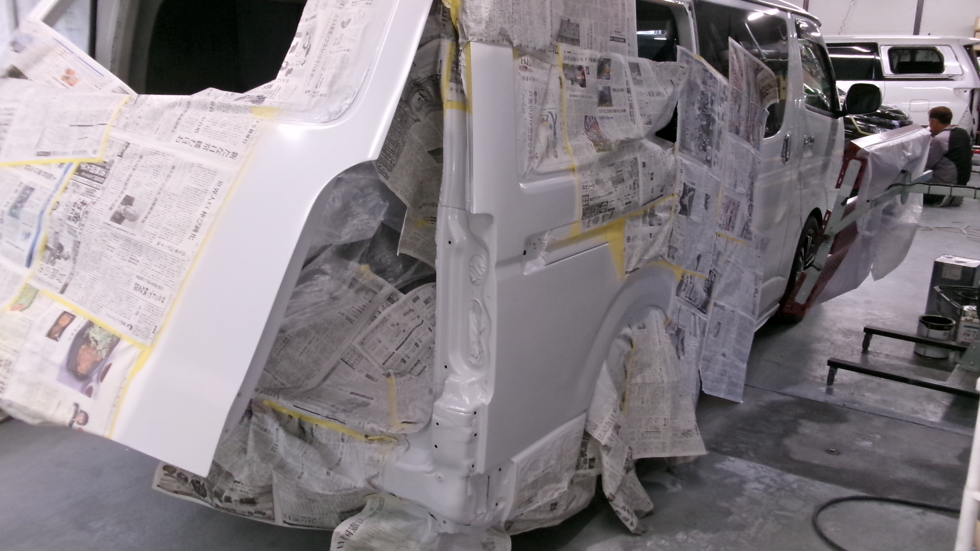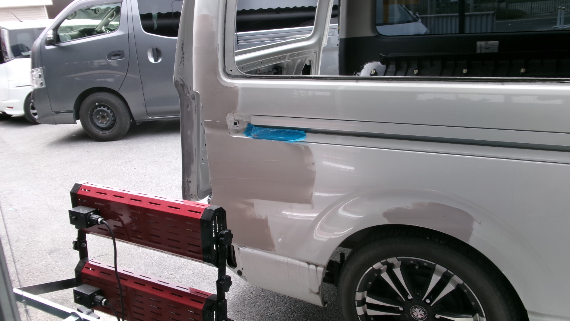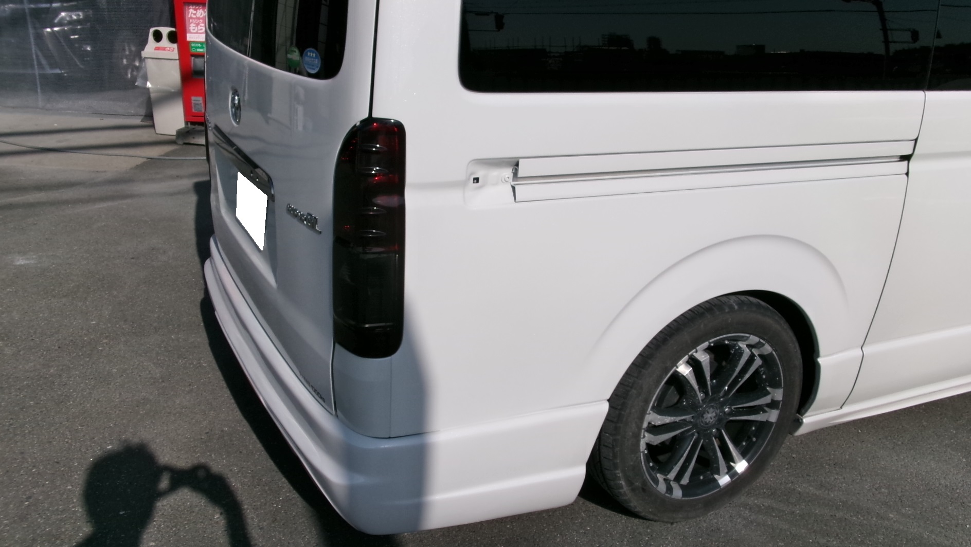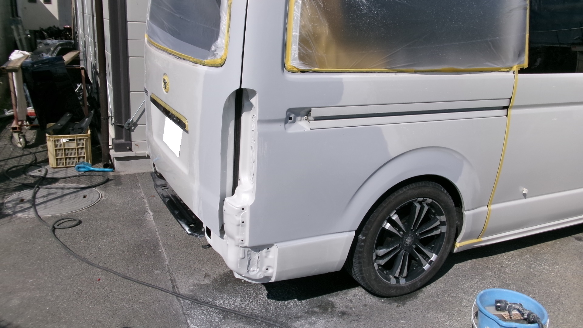 右後ろを華麗にヒットしたハイエースが入庫しました。本来ならばリアゲート交換リアバンパー交換右リアフェンダーを交換する所ですが全て鈑金で直しましたよ・・・。苦労した甲斐があってここまでキレイになりました!