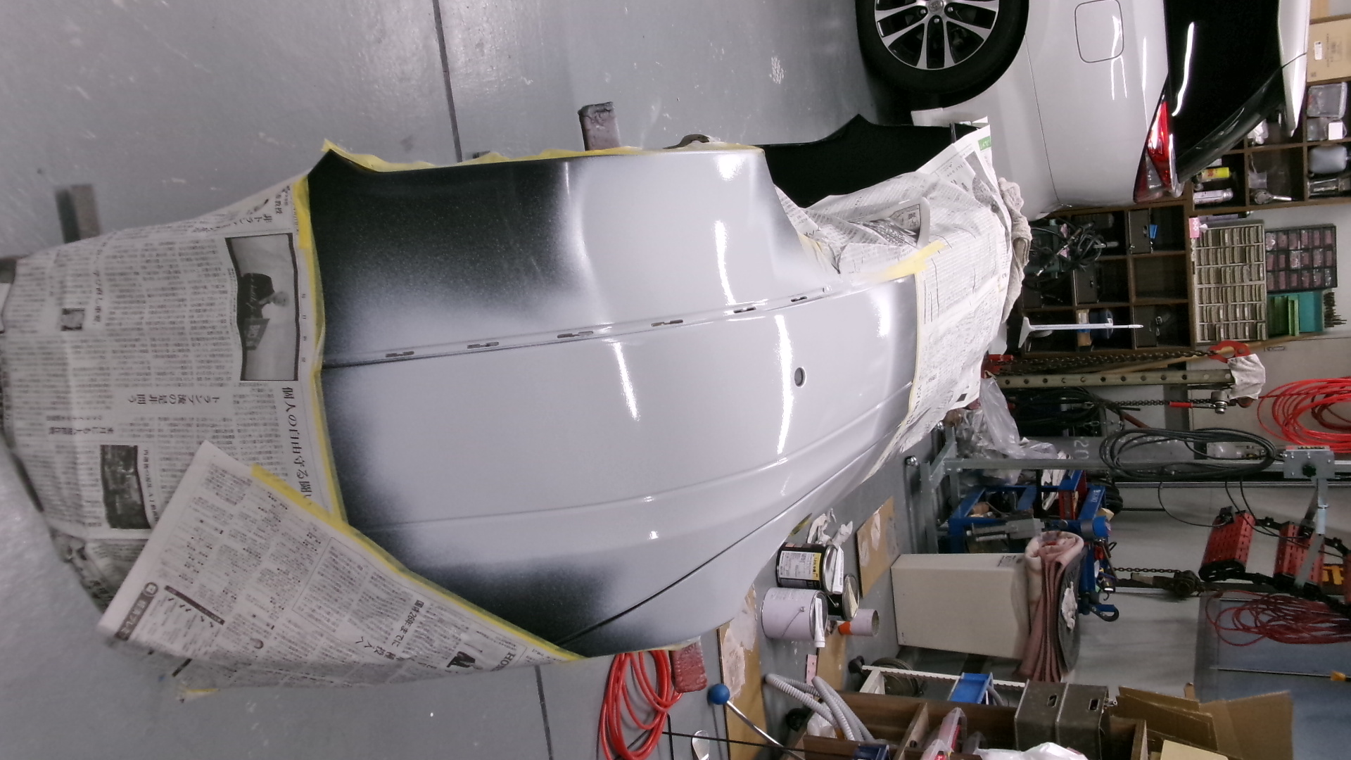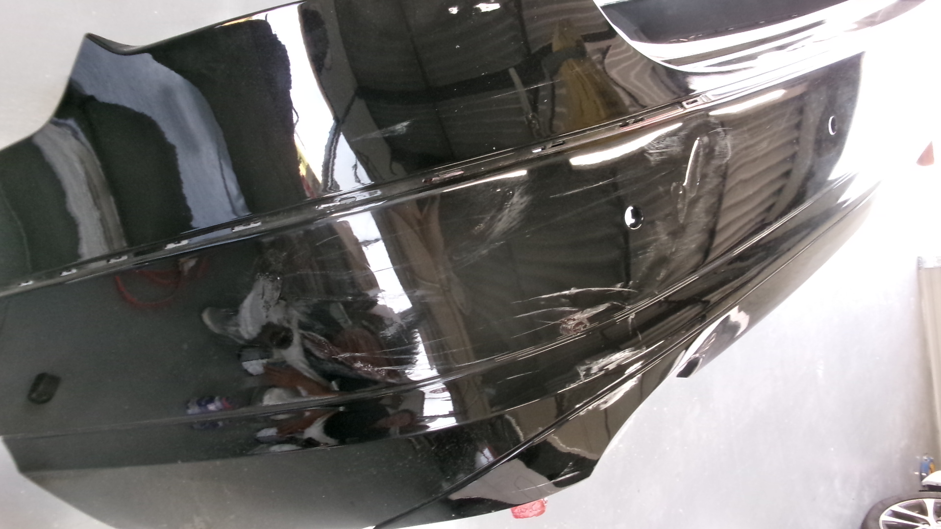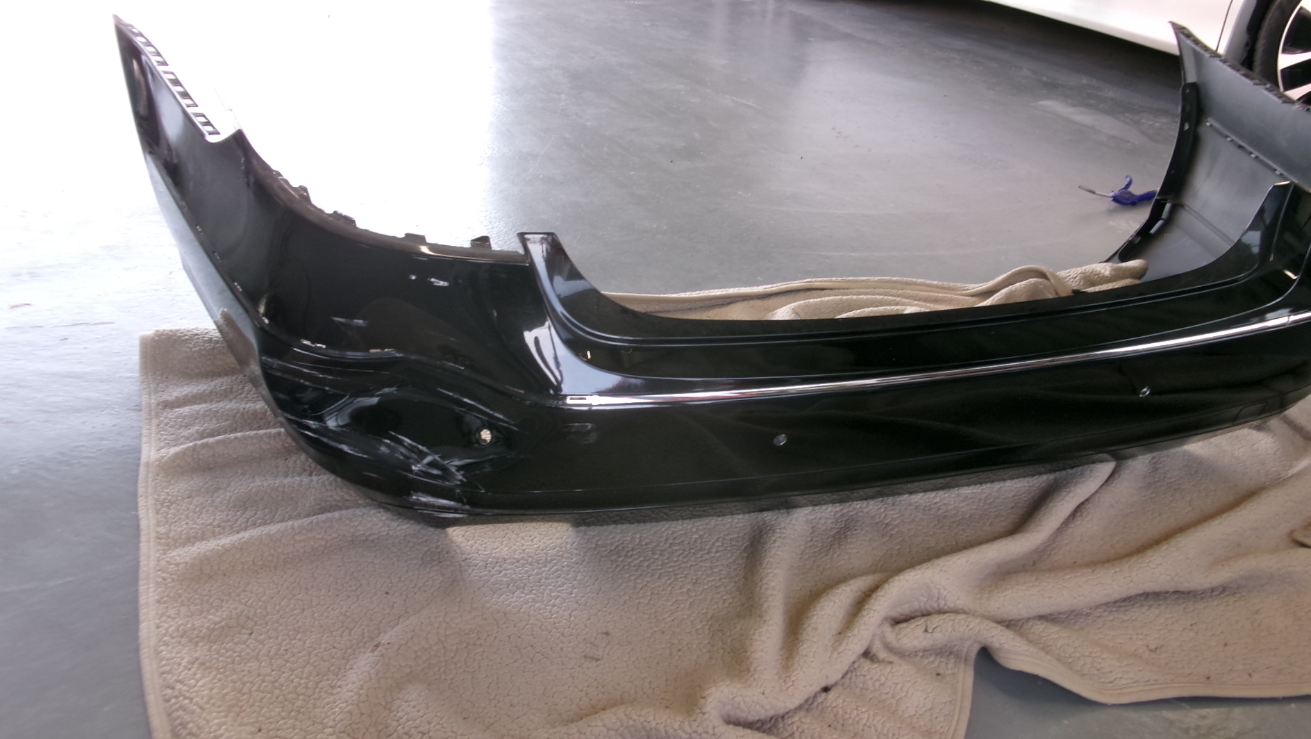 リアバンパーがベッコリと凹んだベンツが入庫しました。バンパーを外して中から戻しても歪んだままでしたので驚異の修正で元通りにしました!歪みの無いパテワークに拍手!!