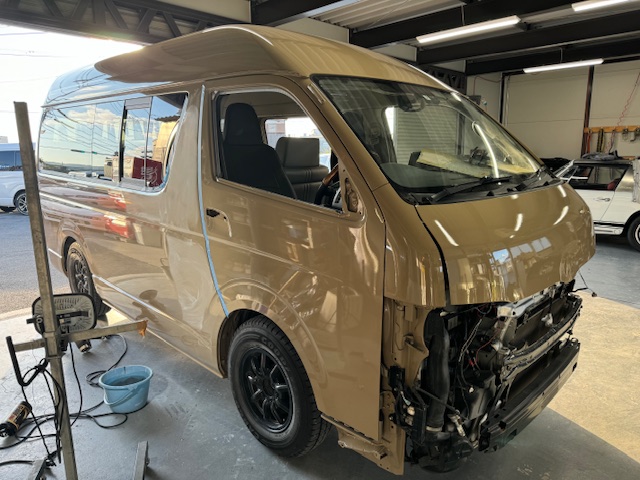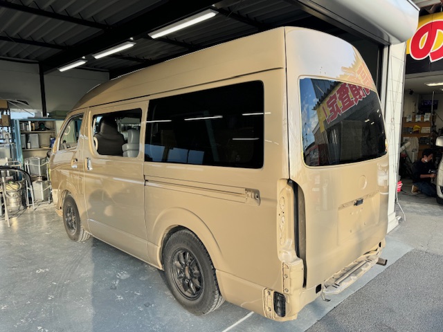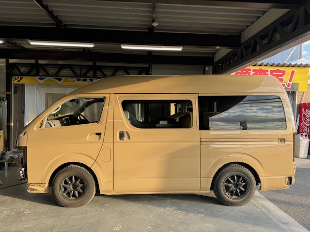 シルバーカラーのハイエースを人気のベージュカラーへオールペイント施工致しました。ベージュへカラー変更することによりアウトドア感が出てお洒落になりました!!またフロント周りを4型仕様変更してより今風な感じの仕上がりとなりました。